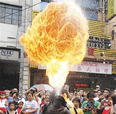 2月19日,菲律宾马尼拉,菲律宾人在街头表演喷火,庆祝中国新年。